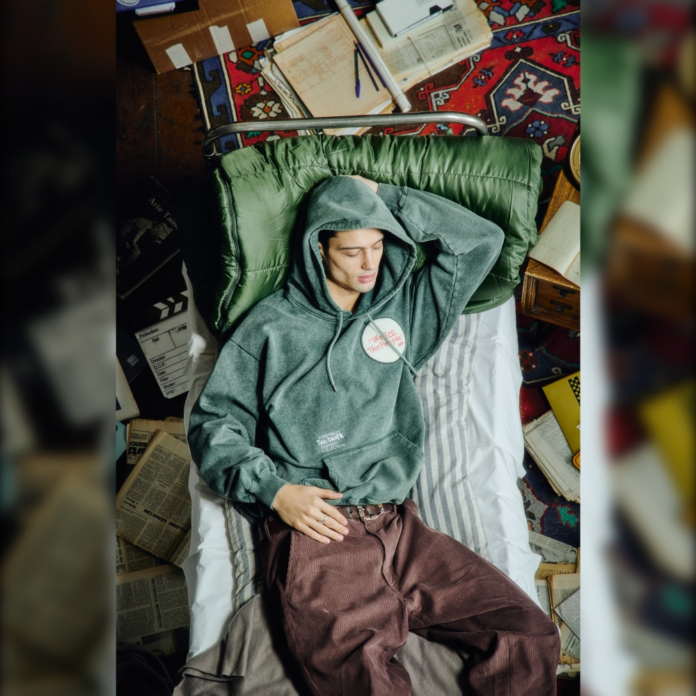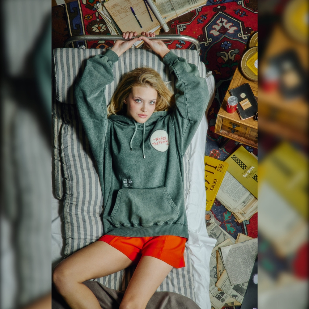 Dark Green Melange Hoodie von Amber&Key aus dichtem, gewaschenem Baumwollstoff mit lockerem Schnitt, überschnittener Schulterlinie und weiten Ärmeln. Klassische Bauchtasche mit Eingriffen von beiden Seiten. Zwei-lagige Kapuze mit Kordelzug aus Baumwolle und Metallösen. Die Kordelenden sind mit Metallkappen versehen. Breite Ärmelbündchen und ein lockeres Gummiband am Saum des Hoodies. Stickerei vorne und auf der Rückseite. Weicher Brustpatch mit Taffeta-Stickerei. Der Patch ist inspiriert von dem Abzeichen mit Motto, das der Hauptcharakter auf seiner Jacke trug. Material: 100% hochwertige, schwere Bio-Baumwolle (450 g, French Terry), hergestellt in Portugal.