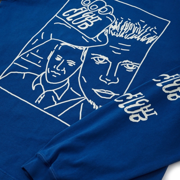 Tiefblaues Baumwoll-Langarmshirt von Amber&Key aus gewaschenem Baumwollmaterial. Lockerer Schnitt, überschnittene Schultern, weite Ärmel mit Gummibündchen. Prints auf der Brust, den Ärmeln und dem Rücken. Auf der Brust des Langarmshirts befindet sich das Zitat aus dem Film „Fight Club“: „I found freedom losing all hope“. Die Bedeutung dieses Zitats interpretieren wir als Aufruf zu einem freien Leben ohne falsche Hoffnungen. Hoffnung, ähnlich einer Illusion, hindert uns daran, aktiv auf das hinzuarbeiten, was wir wirklich wollen. Der Rückenprint ist von der offiziellen Filmposter inspiriert, auf dem die Hauptfiguren mit dem charakteristischen Club-Seifenstück abgebildet sind. Materialzusammensetzung: 100 % Bio-Baumwolle, schweres Gewicht, in Portugal gewebt. 270 g/m².