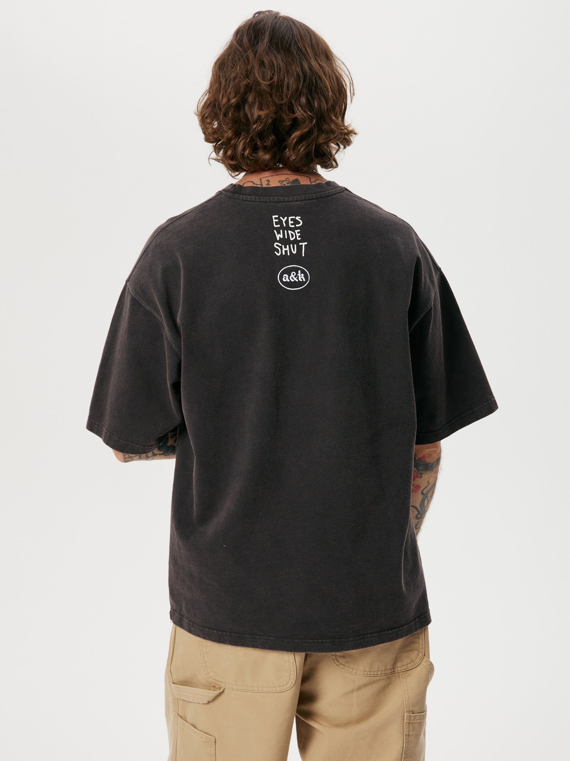 Black t-shirt Amber&Key made from washed cotton. Relaxed fit with a moderately dropped shoulder line. Features a minimalist print and embroidery on the chest and back, inspired by the movie "Eyes Wide Shut". The t-shirt is inspired by a legendary comedic scene where Nicole Kidman, under unique circumstances, asks Tom Cruise: "How do I look?". Main composition: 100% premium quality heavyweight organic cotton, woven in Portugal. 270g, 100% cotton.
