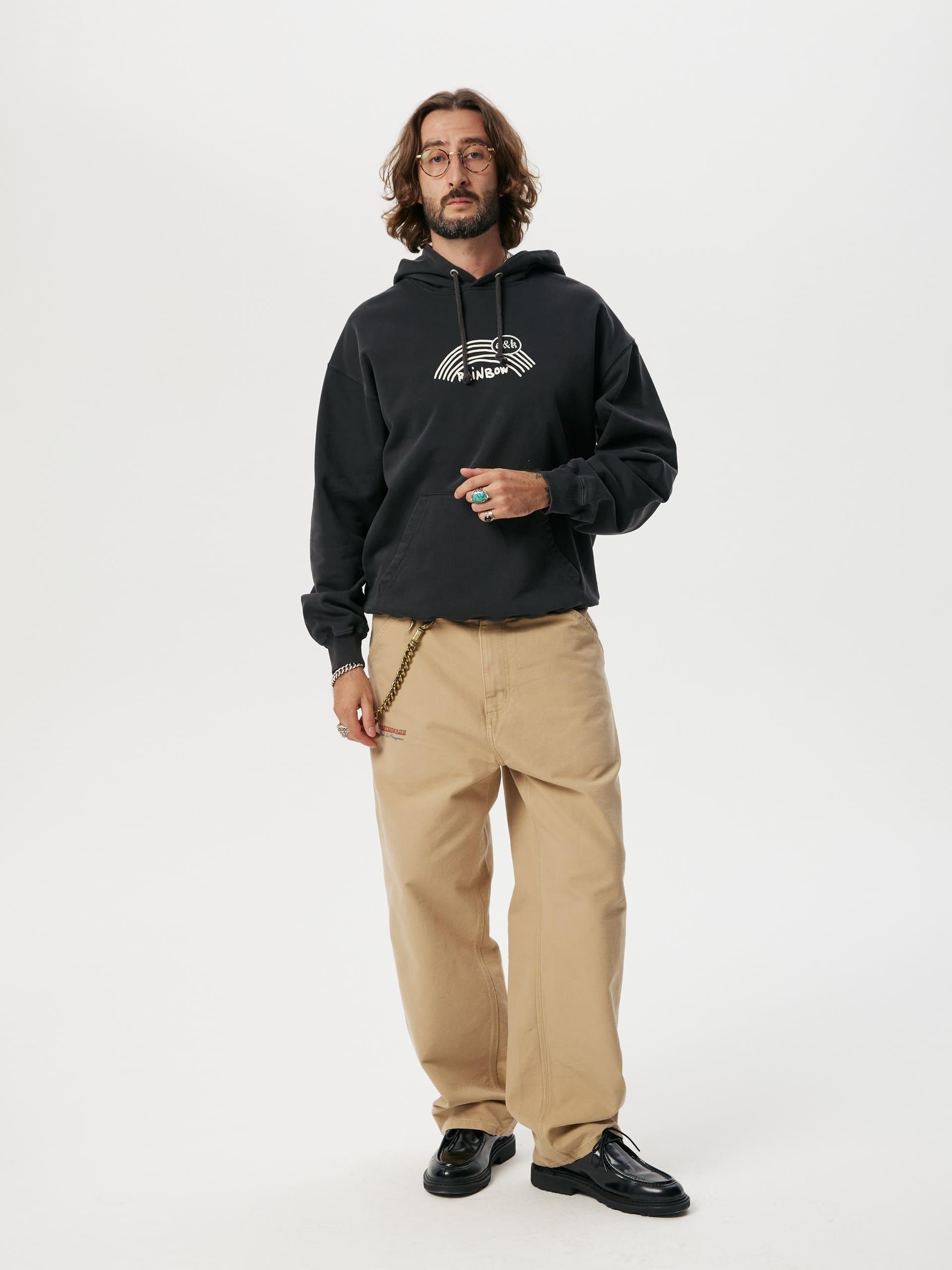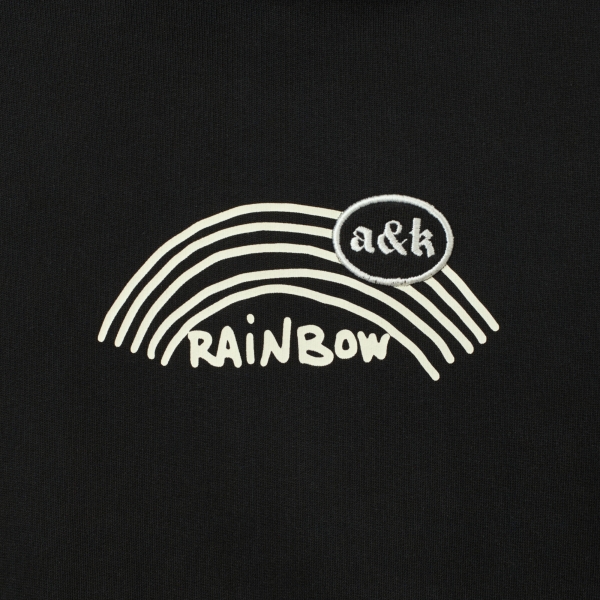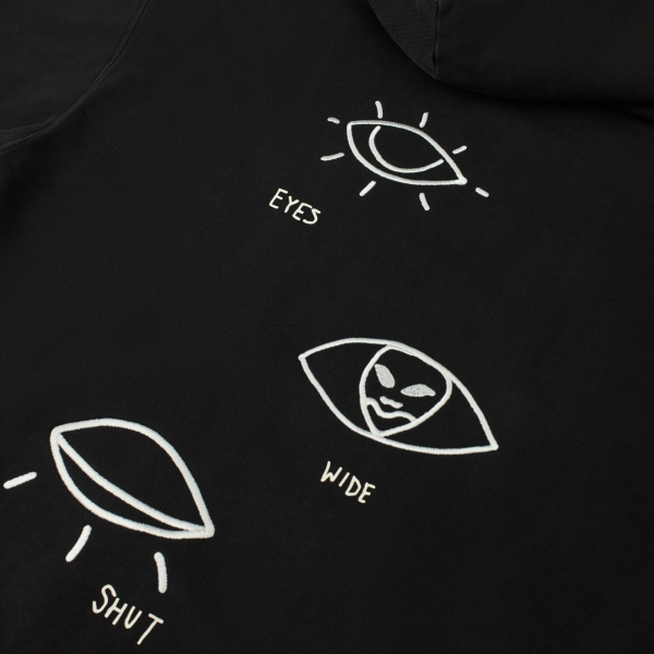 Black hoodie Amber&Key made from washed cotton. Relaxed fit with a dropped shoulder line. Classic central pocket with entries on both sides. Double-layered hood with drawstrings. Features embroidery and print on the chest and back, inspired by the film "Eyes Wide Shut". The graphic references the movie's beginning, where the word "rainbow" is a crucial plot element, mentioned only at the start and end. The eyes serve as an allegory for the movie's title. Main composition: 100% premium quality heavyweight organic cotton, woven in Portugal. 450g, 100% cotton.