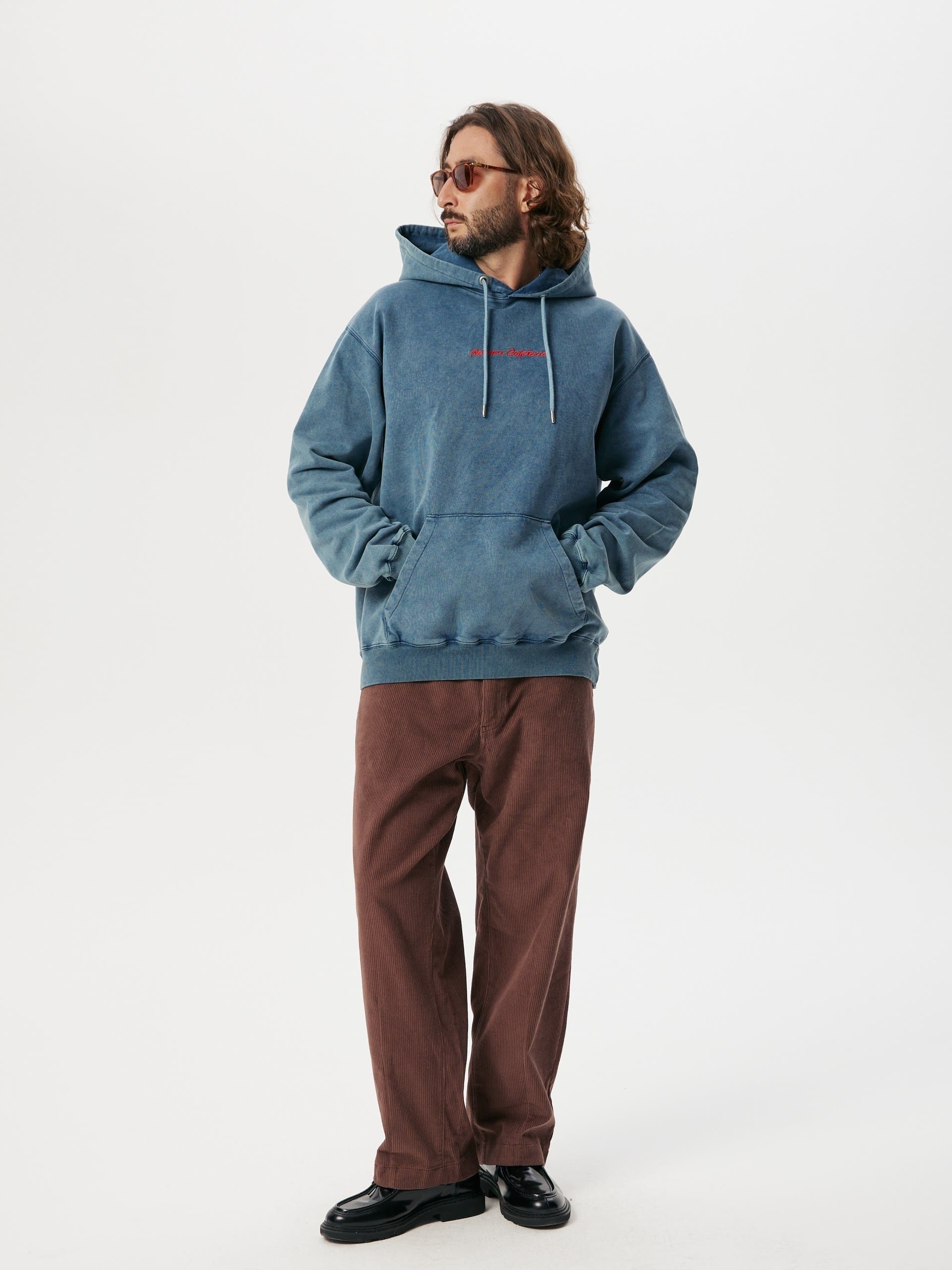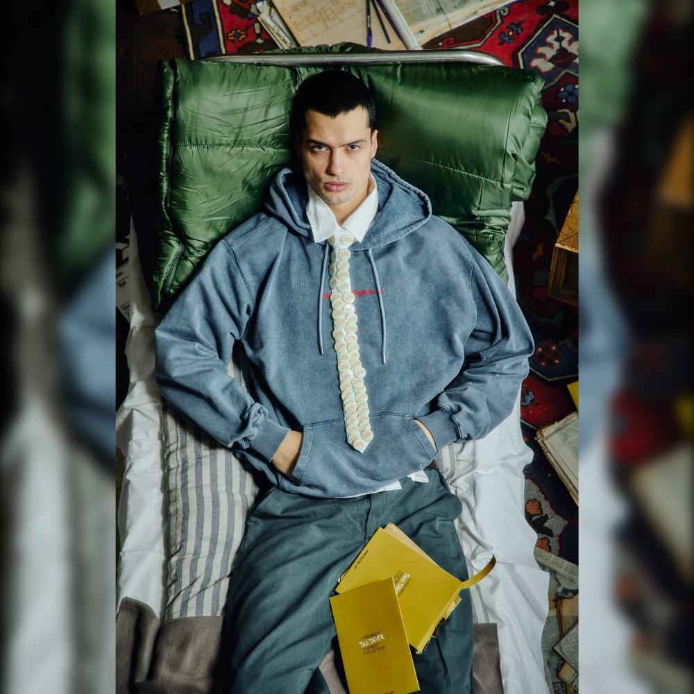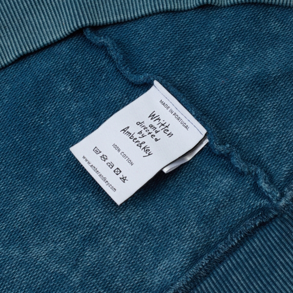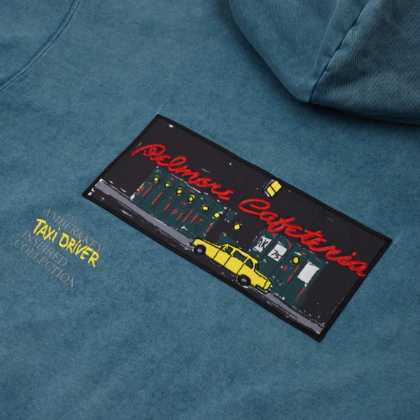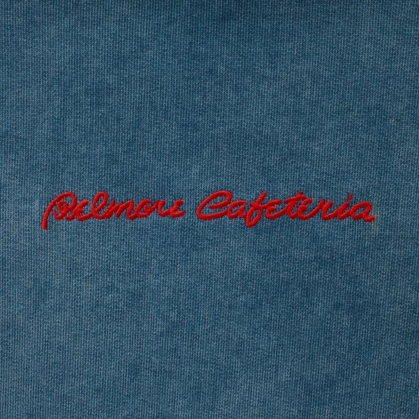 Navy melange hoodie by Amber&Key, crafted from heavy-washed cotton. Designed with a loose silhouette, dropped shoulders, and wide sleeves. Features a classic kangaroo pocket with dual side openings. The hoodie has a double-layered hood with an adjustable cotton drawstring and metal-tipped laces secured with eyelets. The wide sleeves are finished with elastic cuffs. The hem features a relaxed elastic band. Embroidery details are placed on the front and back. The hoodie is inspired by the iconic "Belmore Cafeteria"location where the protagonist spent much of his time. Made from coarse-textured cotton. Main composition: 100% premium quality heavyweight organic cotton, woven in Portugal. 100% French terry cotton (450g).