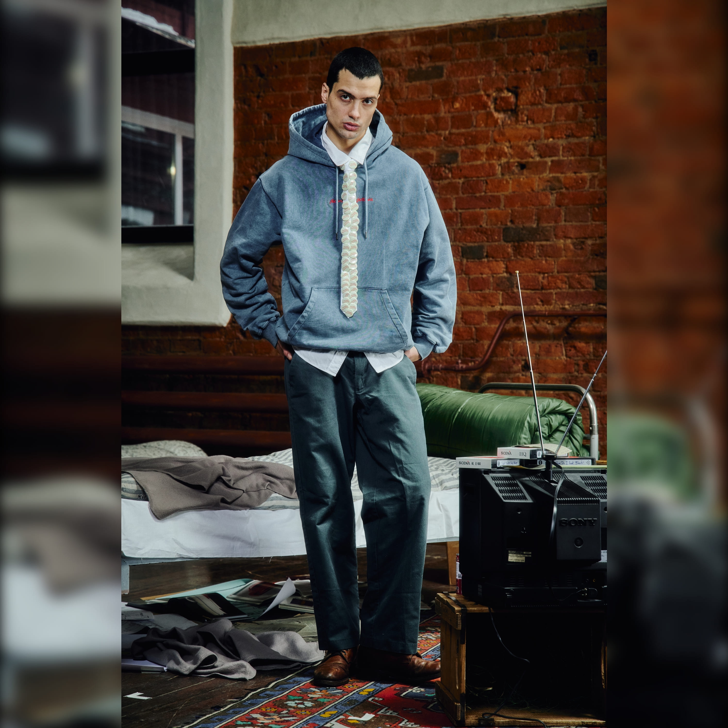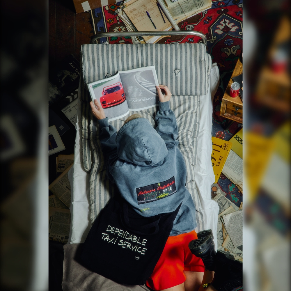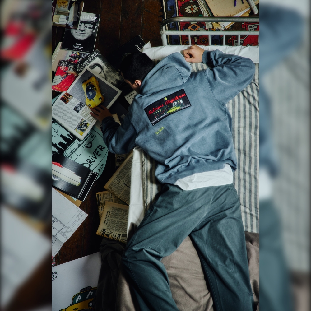 Navy melange hoodie by Amber&Key, crafted from heavy-washed cotton. Designed with a loose silhouette, dropped shoulders, and wide sleeves. Features a classic kangaroo pocket with dual side openings. The hoodie has a double-layered hood with an adjustable cotton drawstring and metal-tipped laces secured with eyelets. The wide sleeves are finished with elastic cuffs. The hem features a relaxed elastic band. Embroidery details are placed on the front and back. The hoodie is inspired by the iconic "Belmore Cafeteria"location where the protagonist spent much of his time. Made from coarse-textured cotton. Main composition: 100% premium quality heavyweight organic cotton, woven in Portugal. 100% French terry cotton (450g).