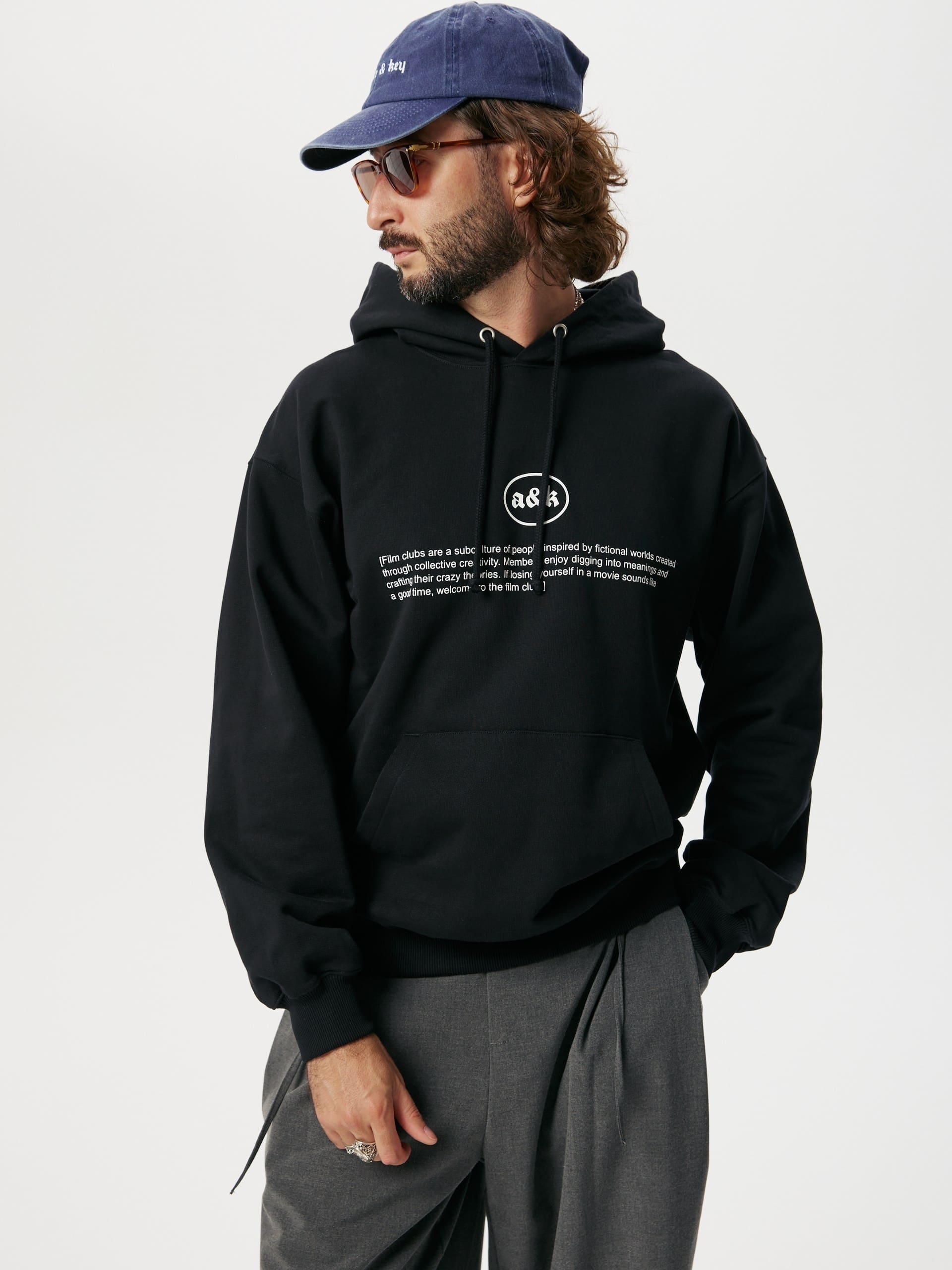 Black hoodie Amber&Key made from washed cotton. Relaxed fit with a dropped shoulder line. Classic central pocket with entries from both sides. Double-layered hood with drawstrings. Prints with brand symbolism on the front and back. Featuring a logo patch on the left sleeve. Main composition: 100% premium quality heavyweight organic cotton, woven in Portugal. 600g, french terry, 100% cotton.