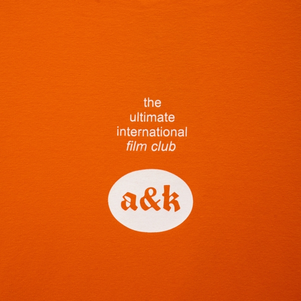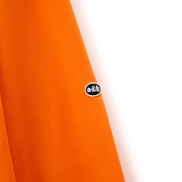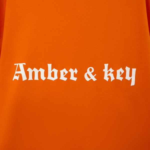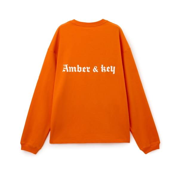Orange cotton long-sleeve tee Amber&Key. The front is smooth, while the reverse side is noticeably textured. Relaxed fit, dropped shoulder line. Simple prints with brand symbolism on the front and back. Main composition: 100% premium quality heavyweight organic cotton, woven in Portugal. 320g, 100% cotton.