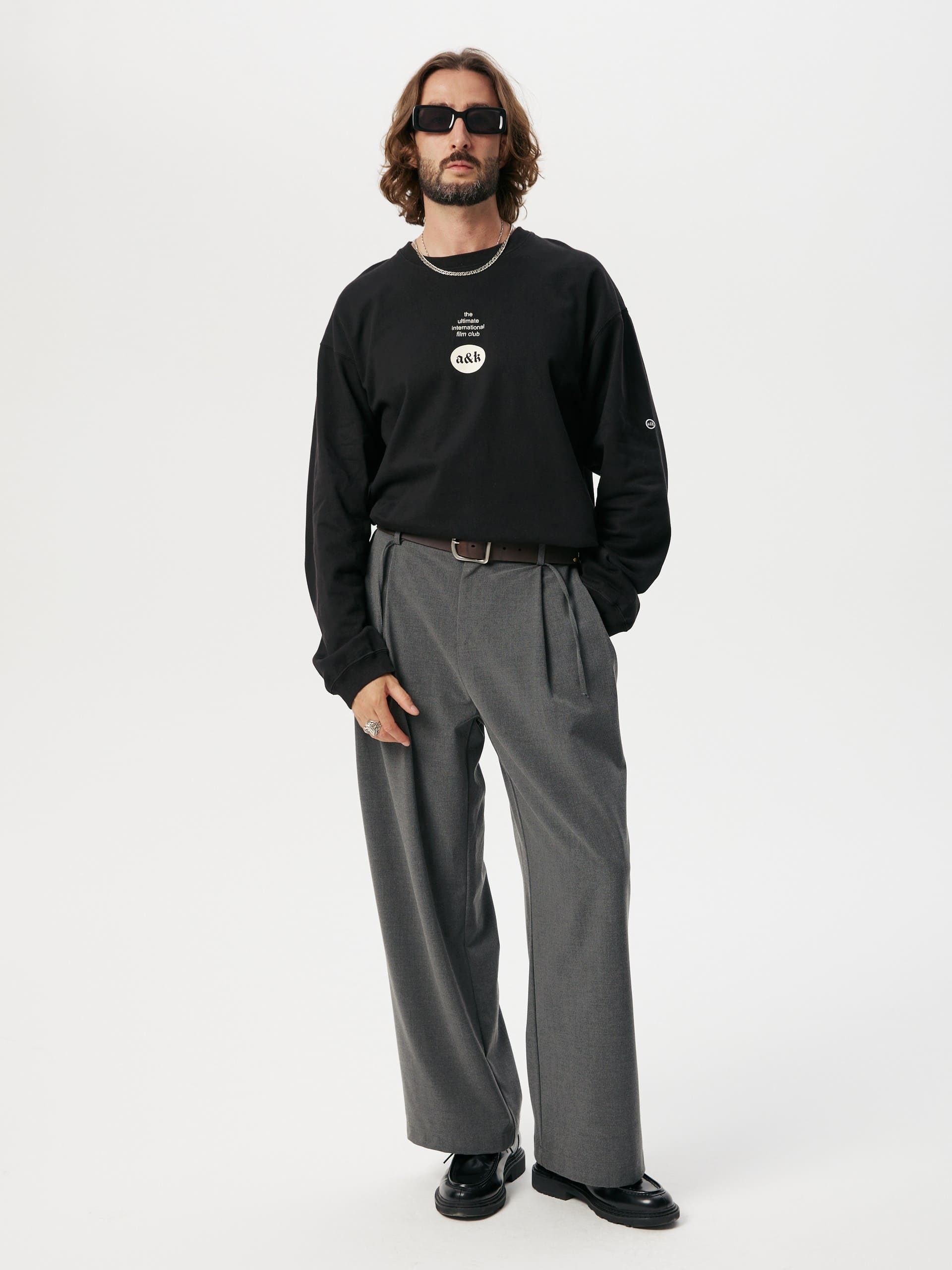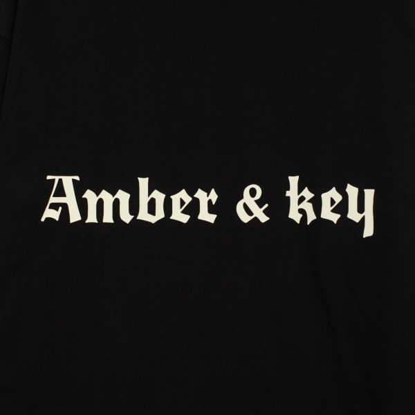 Black cotton long-sleeve tee Amber&Key. The front is smooth, while the reverse side is noticeably textured. Relaxed fit, dropped shoulder line. Simple prints with brand symbolism on the front and back. Main composition: 100% premium quality heavyweight organic cotton, woven in Portugal. 320g, 100% cotton.