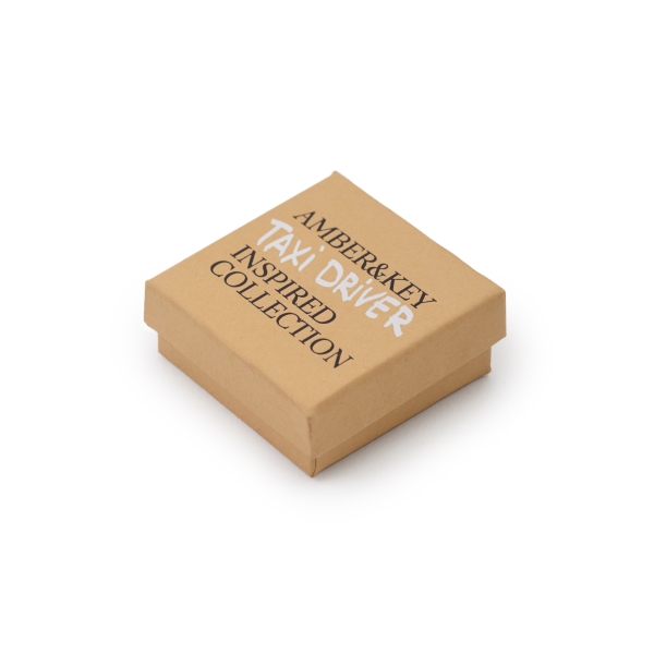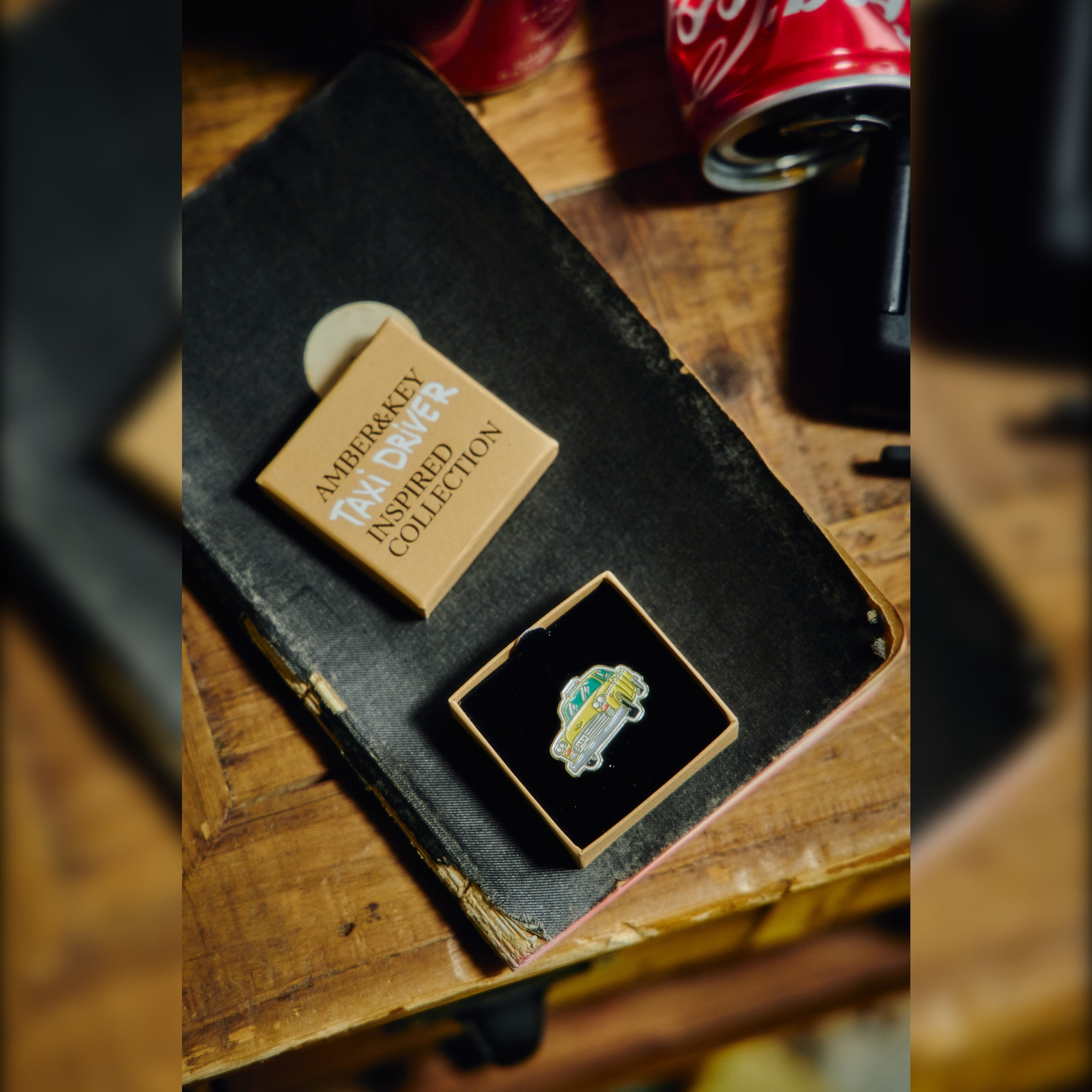 Amber&Key metal pin featuring brand symbolism, designed in the shape of the taxi driven by the protagonist in Taxi Driver. Made from metal with a durable enamel coating.