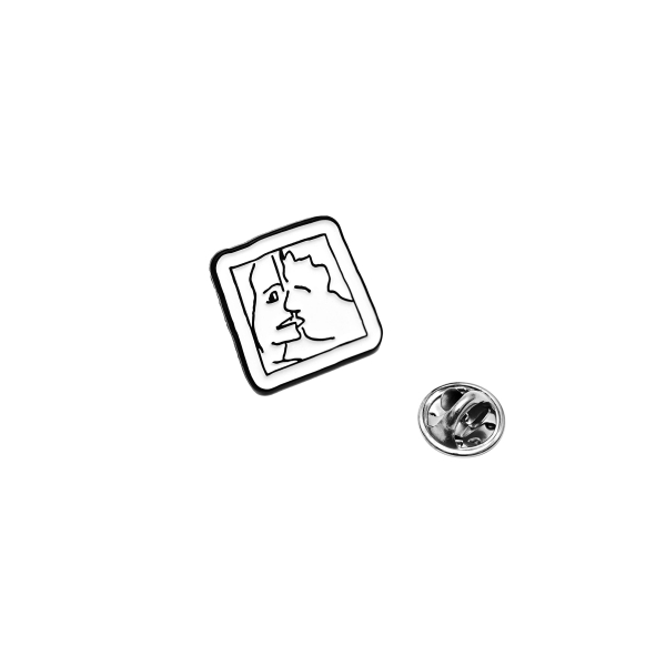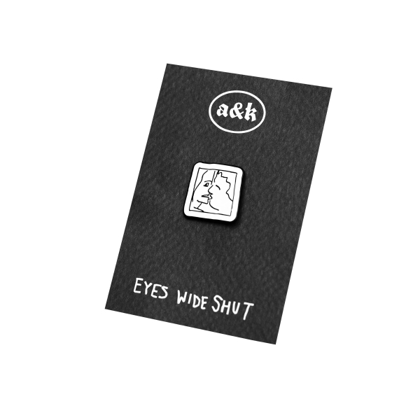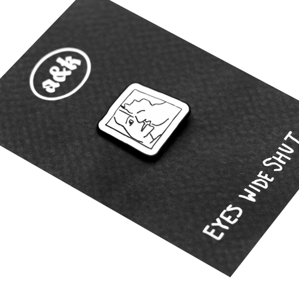 Metallische Anstecknadel von Amber&Key mit Markensymbolik und Illustrationen, gestaltet nach dem Film "Eyes Wide Shut". Die Zeichnung verweist auf das Hauptfilmplakat, das zur Premiere von "Eyes Wide Shut" vorbereitet wurde. Metall mit farbigem Lackauftrag.