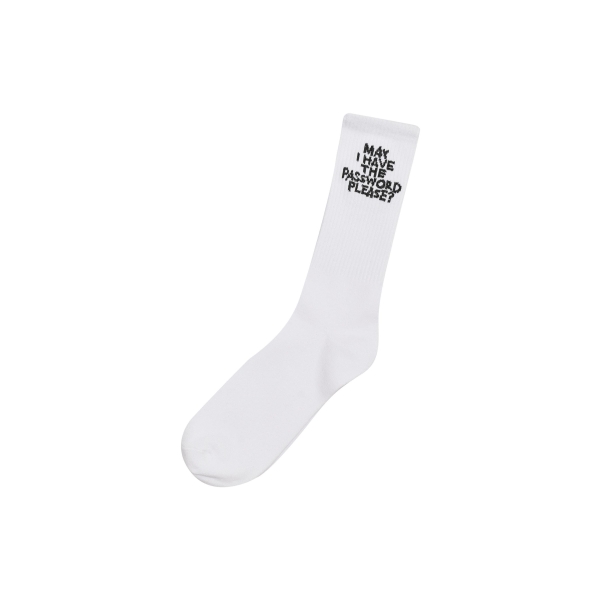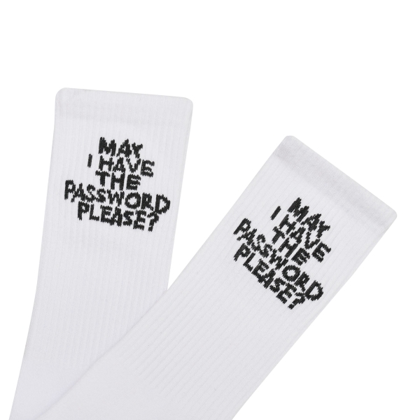 White long cotton socks Amber&Key with embroidery inspired by the film "Eyes Wide Shut". This piece is inspired by a key scene where the protagonist is asked for a password upon entering a secretive event.Main composition: 100% premium quality heavyweight organic cotton, woven in Portugal. 80% cotton, 15% polyester, 5% elastane.