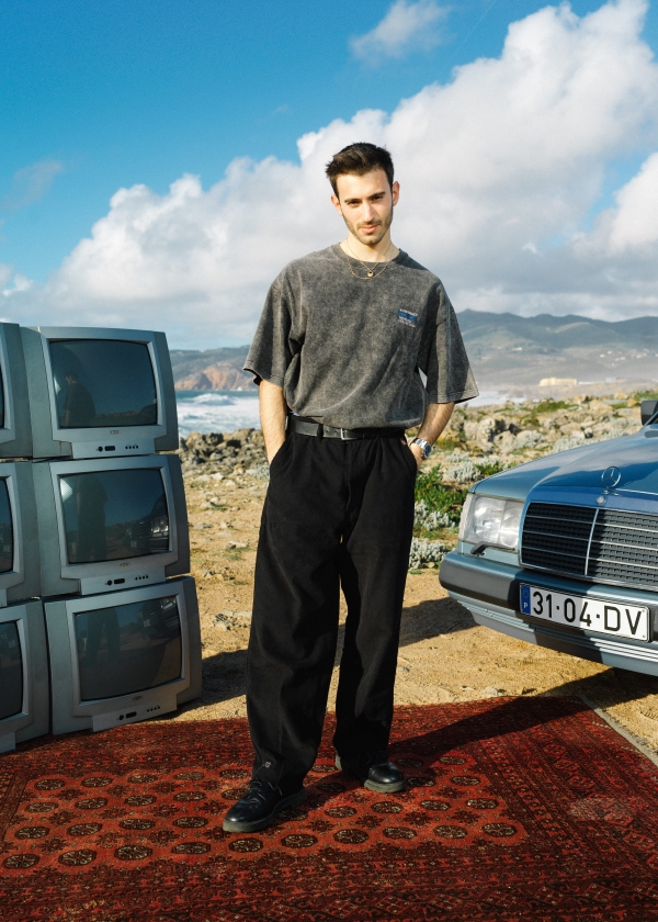 Dark-grey Amber&Key t-shirt made from washed cotton. Featuring a relaxed, loose silhouette and dropped shoulder design. The front and back are adorned with prints. The chest print is enhanced by intricate embroidery. A digital print on the back references a grainy photograph, evoking a cinematic aesthetic. This piece draws inspiration from the final scene of the movie: the protagonist gives his love interest a ride, and their eyes meet in the rearview mirror. Main composition: 100% premium quality heavyweight organic cotton, woven in Portugal. 100% open-end cotton (270g).