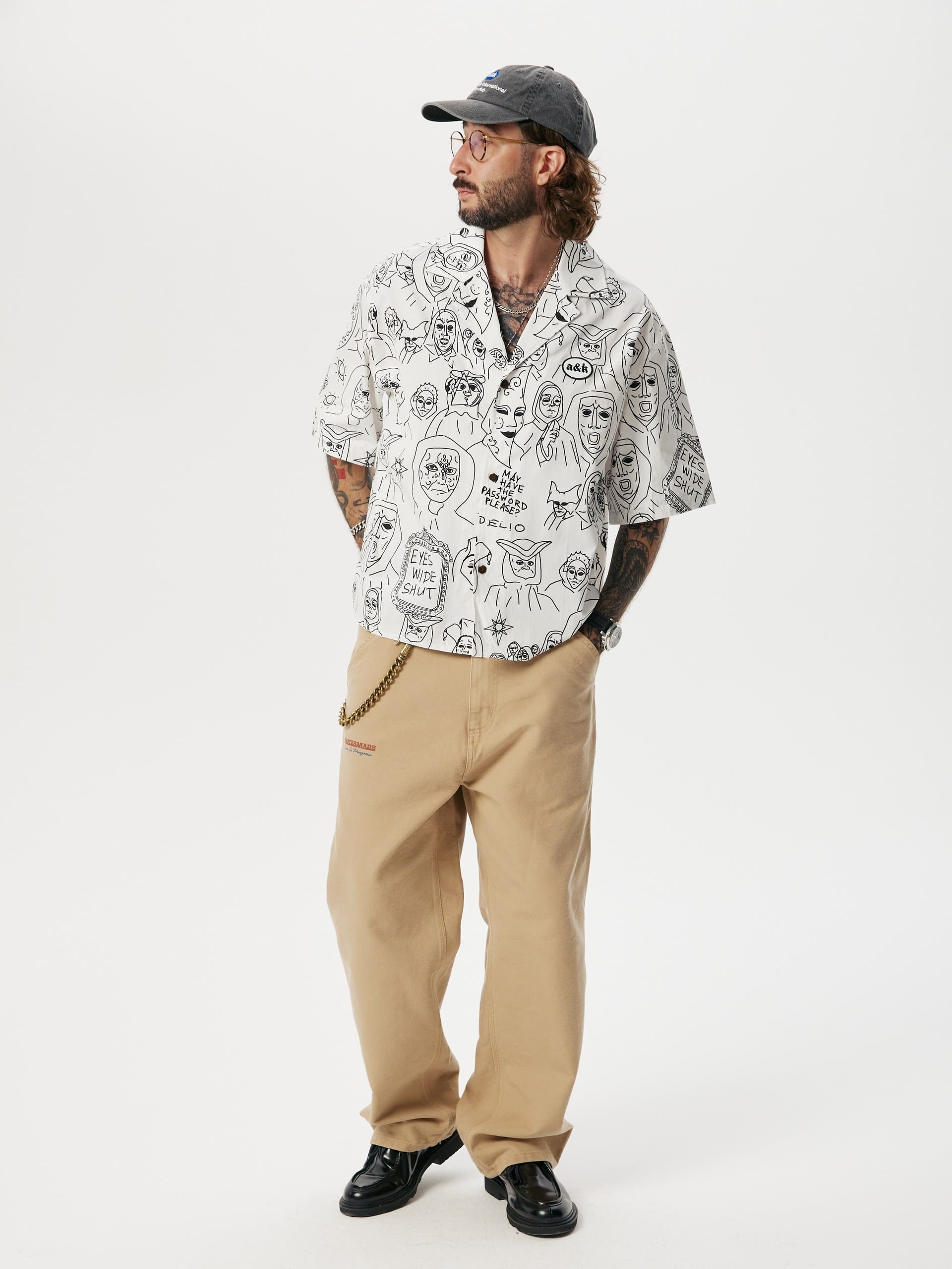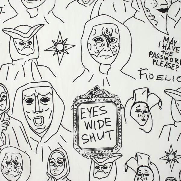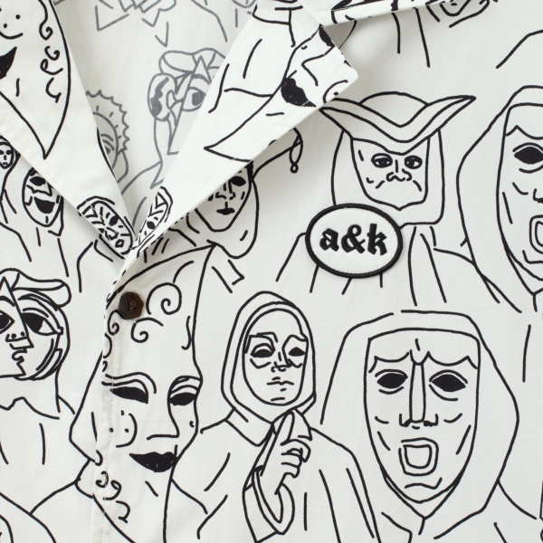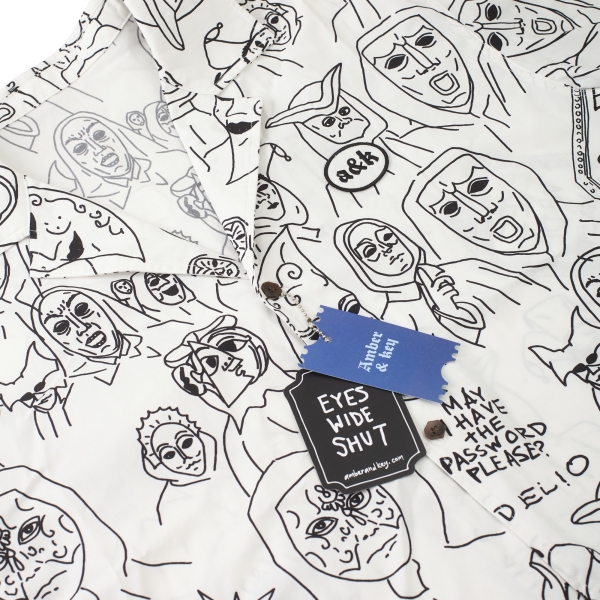 White straight fit cotton shirt Amber&Key. Pointed collar. Relaxed silhouette with a moderately dropped shoulder line. Prints inspired by the film "Eyes Wide Shut". The shirt is inspired by the most striking carnival scene where all participants were cloaked, and their faces were hidden behind carnival masks.Main composition: 100% premium quality heavyweight organic cotton, woven in Portugal. Poplin/Cotton.
